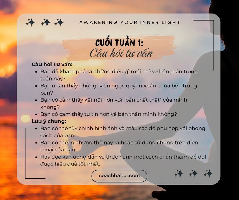 Awakening Your Inner Light là hành trình 31 ngày được thiết kế để dẫn dắt bạn khám phá sức mạnh nội tại, thanh lọc tâm trí, kết nối sâu sắc với bản chất thật của mình. Thông qua các bài thực hành thiền định, phản ánh và kết nối cộng đồng, chương trình sẽ giúp bạn đánh thức tiềm năng vô hạn và lan tỏa ánh sáng độc đáo của bạn ra thế giới.